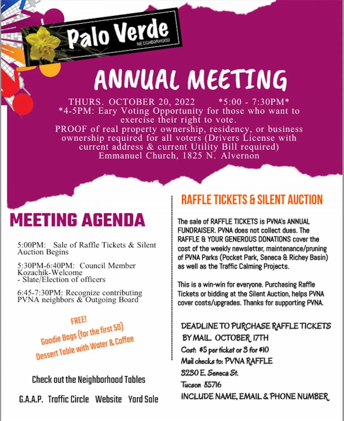 PVNA Annual Meeting Thursday, October 20, 2022 6:30 PM 8:00 PM Emmanuel Baptist Church 1825 North Alvernon Way Tucson, AZ, 85712 United States (map) Google Calendar ICS